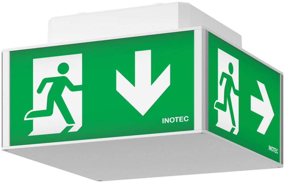 Vierzijdig vluchtrouteaanduiding armatuur gemaakt van wit UV- en gloeidraadbestendig polycarbonaat en voorzien van geanodiseerd aluminium hoekprofielen. Homogene pictogramverlichting door geoptimaliseerde LED technologie met een lichtopbrengst > 500 cd/m². Pictogrammen kunnen individueel aan iedere kant van het armatuur worden gewisseld.
