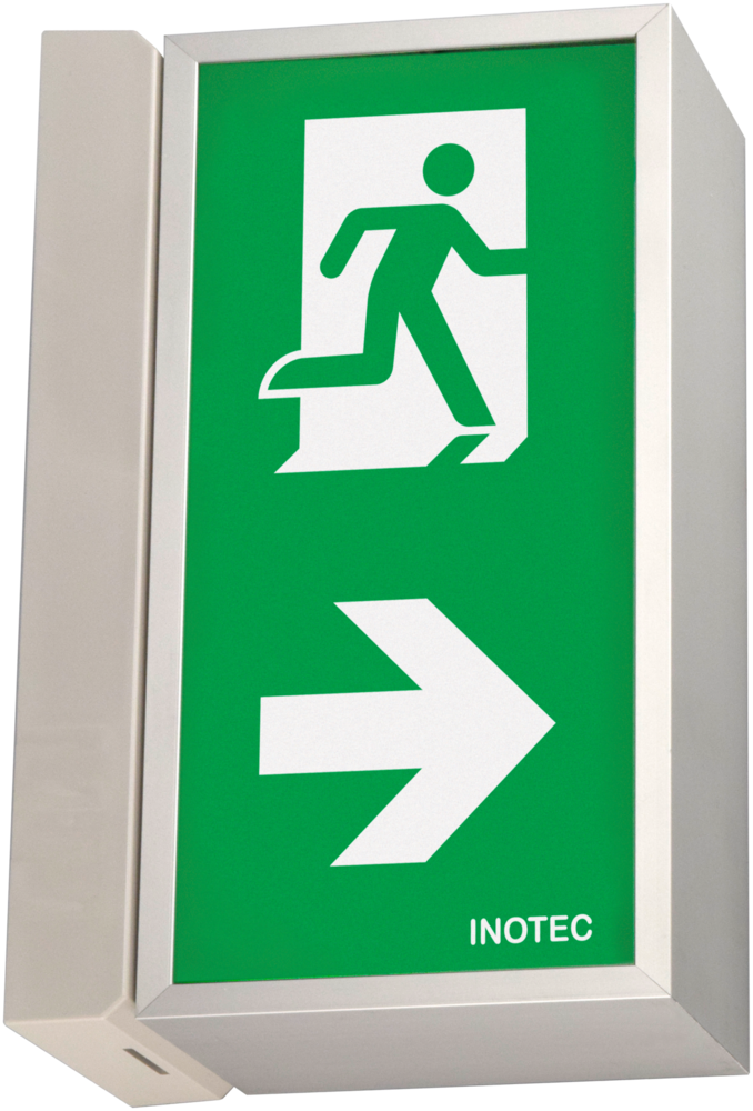 Dubbelzijdig vluchtrouteaanduiding armatuur gemaakt van hoogwaardig aluminium profiel. Bijzonder vlak design met een perfect homogeen uitgelicht pictogram door geoptimaliseerde LED technologie met een lichtopbrengst > 500 cd/m².