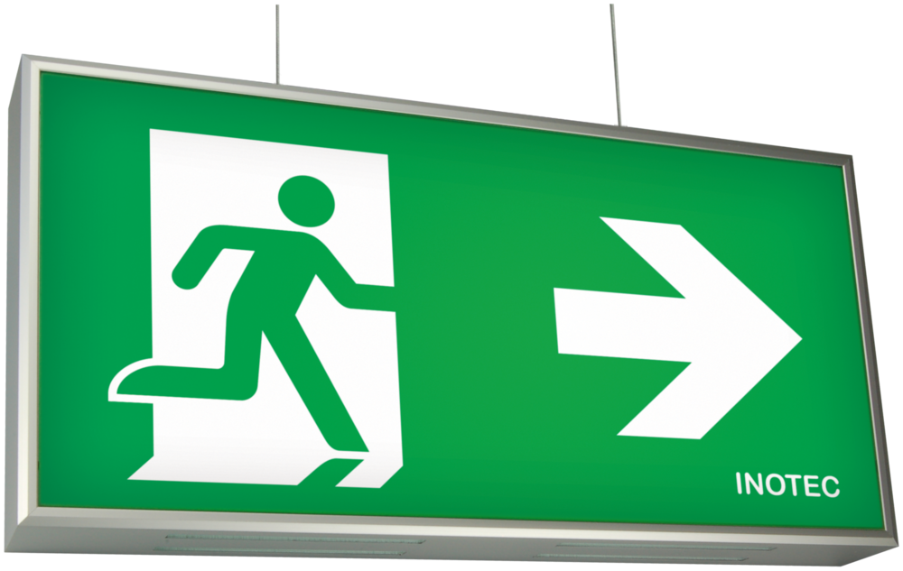 Dubbelzijdig vluchtrouteaanduiding armatuur gemaakt van aluminium profiel met extra lichtafgifte naar beneden. Perfect homogeen uitgelicht pictogram door geoptimaliseerde LED technologie met een lichtopbrengst > 500 cd/m². Leverbaar in elk gewenste RAL kleur.