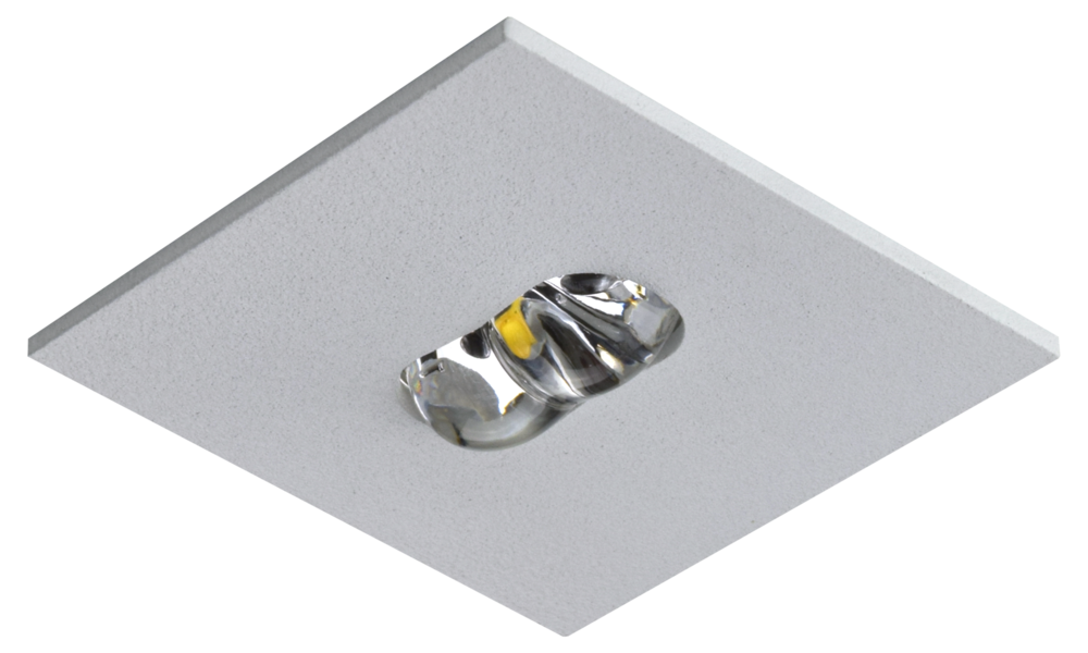 Subtiel LED vluchtrouteverlichting armatuur met geoptimaliseerde lichtspreiding t.b.v. vluchtroutes waar een langwerpig lichtpatroon wenselijk is, zoals in gangen en rechthoekige ruimtes. Afdekking van gepoedercoat aluminium met een diameter of randlengte van slechts 45 mm. Armatuur incl. driver voor installatie in Ø 38mm plafonduitsparing.